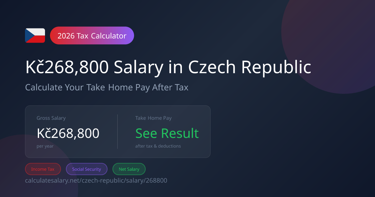 If you earn CZK 268,800 per year in Czech Republic, you will take home CZK 228,139 after tax and social security. That's CZK 19,012 per month.