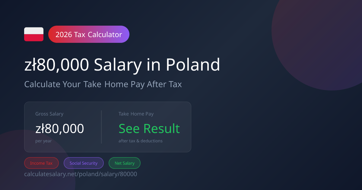 If you earn PLN 80,000 per year in Poland, you will take home PLN 58,495 after tax and social security. That's PLN 4,875 per month.
